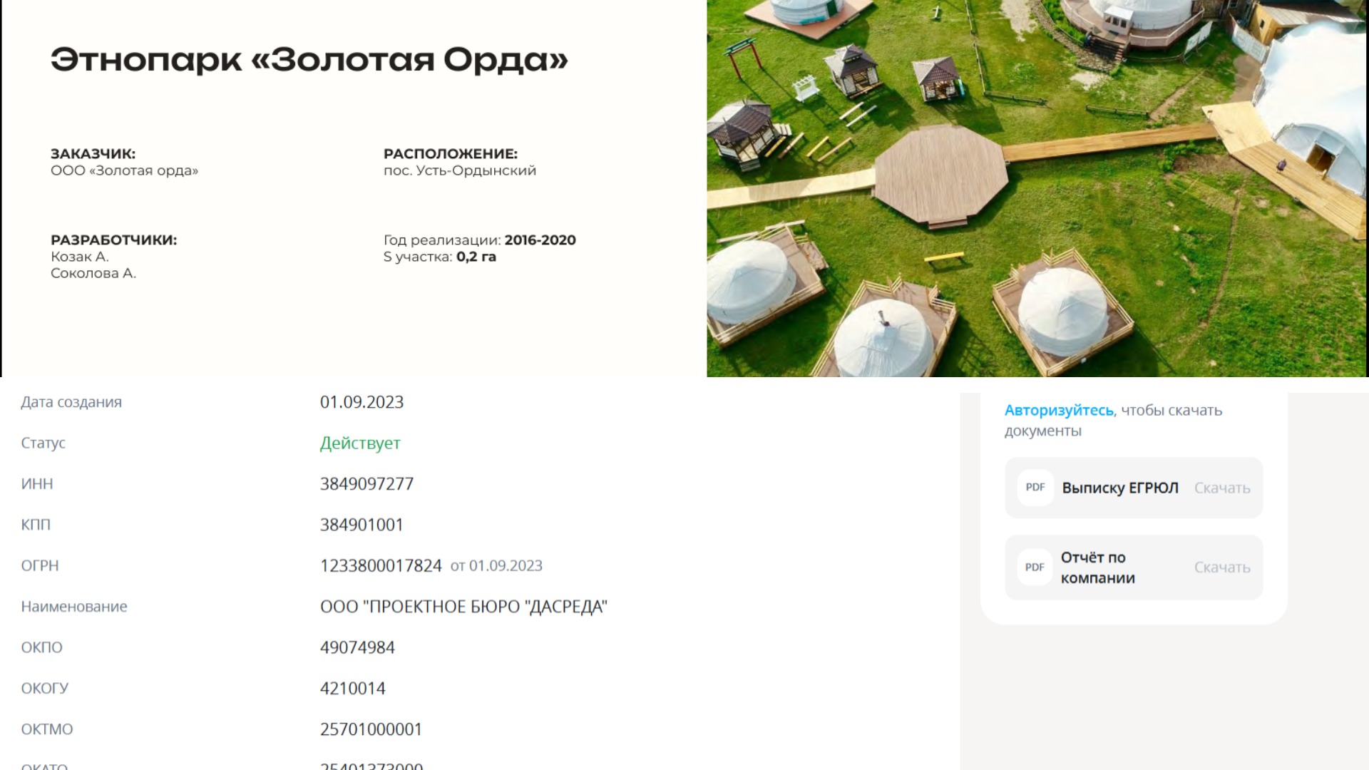 Ранее Бабр подробно разобрал структуру этой фирмы. Напомним, ООО «Проектное Бюро "Дасреда"» (ОГРН 1233800017824) зарегистрировано в сентябре 2023 года. В презентациях компания заявляет о девяти годах опыта и 100 реализованных проектах: этнопарк «Золотая Орда», парк «Северное сияние Байкала» и другие. Юридически эти проекты принадлежат старому юрлицу с похожим названием, но которое сейчас финансово несостоятельно.
