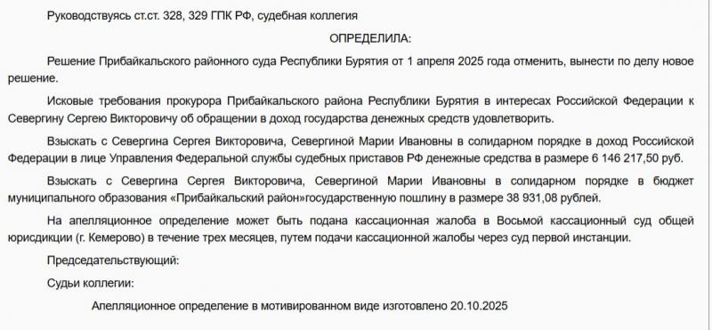 Прокурор Прибайкальского района в 2024 году заинтересовался доходами этой семьи. В ходе проверки выяснилось, что в 2021 году на личные банковские карты Марии Севергиной поступило более шести миллионов рублей. При этом официальный доход чиновника и его жены за три года вместе взятых составил всего 2,4 миллиона рублей. Прокуратура подала иск о взыскании в доход государства суммы, которую семья не смогла подтвердить законными источниками.