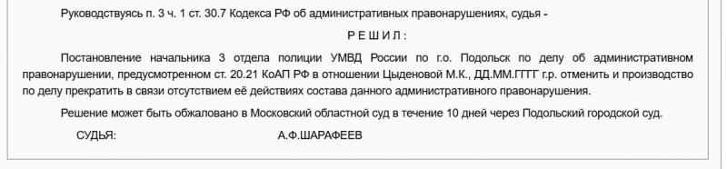 Постановление суда города Подольска об отмене административного протокола в отношении Цыденовой