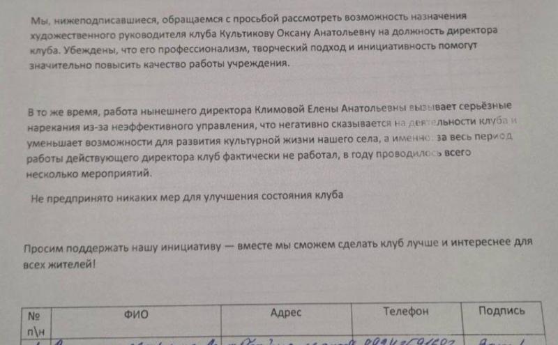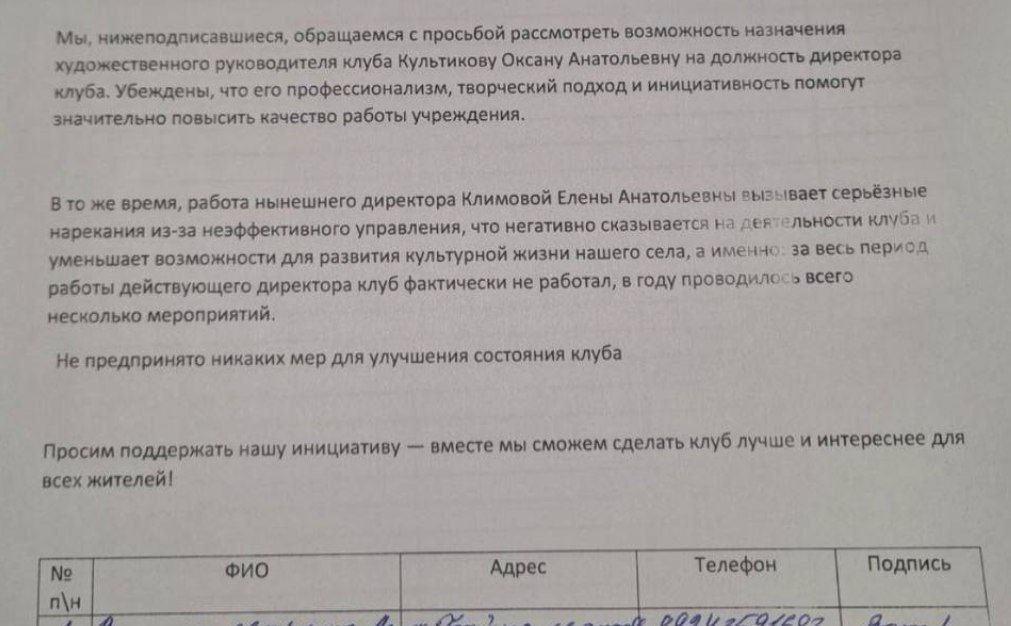 Жители Максимихи к сходу 26 февраля собрали подписи за отставку Елены Климовой. Люди требовали назначить руководителем клуба новую сотрудницу учреждения, которая за короткий срок организовала в клубе плетение маскировочных сетей и проявила инициативу в развитии сельской культуры. До её прихода волонтёры не получали помощи от администрации, хотя чиновники постоянно используют патриотическую риторику.