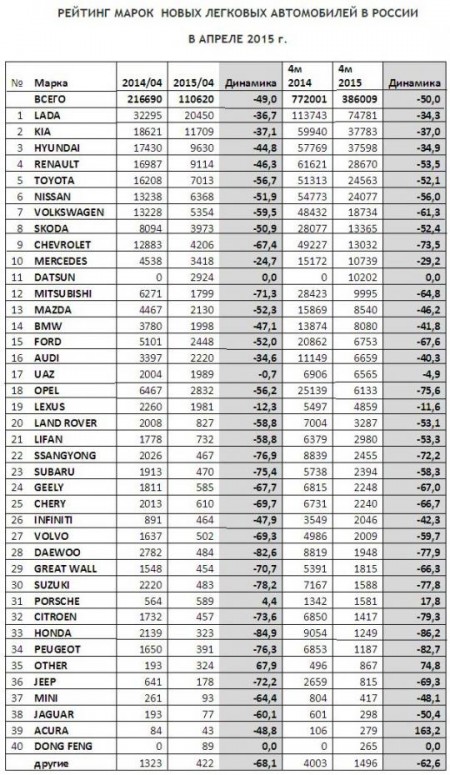 По результатам исследования АА «АВТОСТАТ», в апреле 2015 года в России было продано всего чуть более 110 тысяч новых легковых автомобилей. Это на 49% меньше, чем в апреле прошлого года.