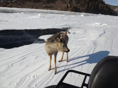 В районе посёлка Большого Голоустного на открытый лёд забралась дикая косуля. Вероятнее всего, животное оказалось там, спасаясь от хищника. Её заметил патрулировавший территорию Андрей Осипчук, руководитель Западно-Байкальской группы патрульной службы № 2.