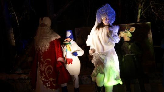 На праздничном представлении гостей праздника веселили и развлекали сказочные герои: Ёлка, Снеговик, Баба Яга и, конечно же, Дед Мороз со своей внучкой Снегурочкой.