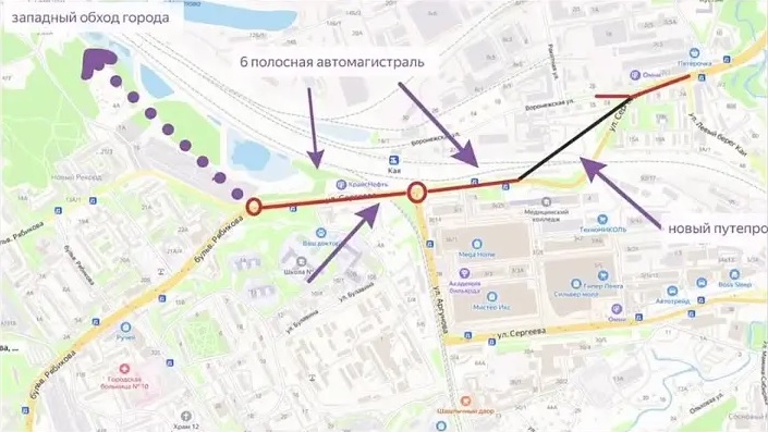Наиболее предпочтительным стал вариант с реконструкцией обоих путепроводов и перекрёстка улиц Сергеева и Аргунова. В нём нужно убрать светофор на пересечении улиц Воронежской и Медведева, построить подземный пешеходный переход на остановке «Кайский переход». Также есть возможность построить путепровод через улицу Сергеева в районе улицы Маршала Конева.