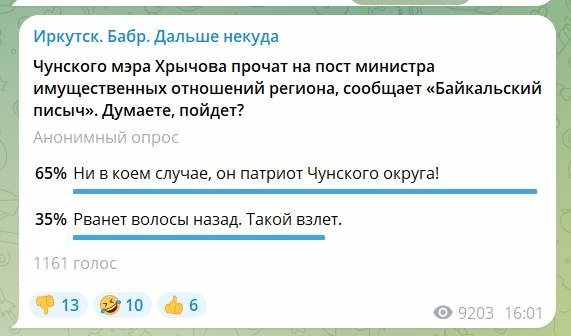 Кстати, в контексте исхода из регионального правительства целой вереницы топов появилась информация, что Хрычова рассматривают на позицию министра сельского хозяйства имущественных отношений Прибайкалья, опустевшую еще в мае. Кстати сказать, такое сообщение вызвало большой интерес.