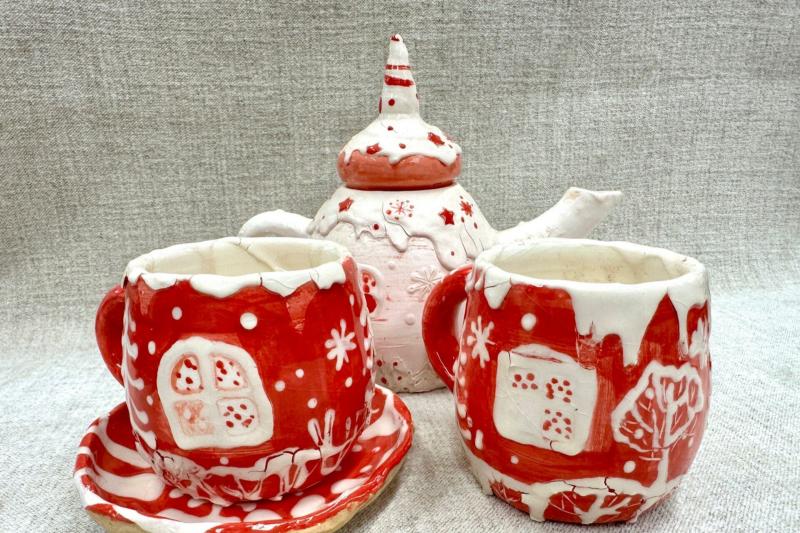 На занятии гости смогут сделать чайную пару: чашку и блюдце, познакомиться с базовыми техниками работы на гончарном круге и освоить формовку изделия из пласта. Завершится работа над чайной парой декорированием изделий в технике пастилаж, особенность которой заключается в том, что рисунок формируется за счёт растекания ангоба по влажной поверхности.