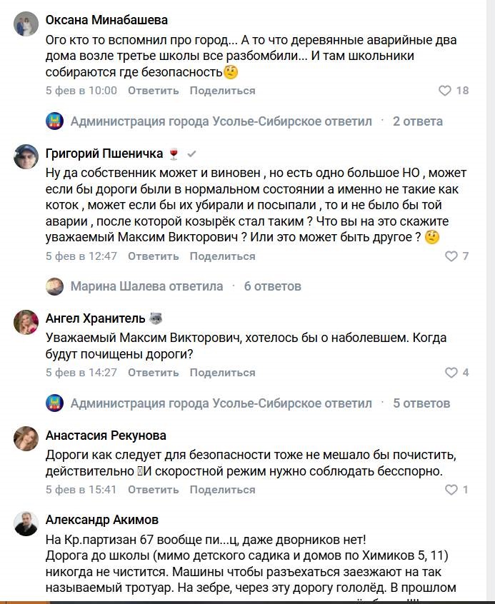 Кстати, далеко не все представительства мэров региона во «Вконтакте» – а им сейчас не погано только там да в «Одноклассниках» – посещаются кем-то еще. Во всяком случае, комментариев там нет. Но среди приятных исключений – страница главы Усолья Максима Торопкина. Тут постоянно дружеские дискуссии. Вот посетовал Максим Викторович на рухнувший козырек чьей-то недвижимости.