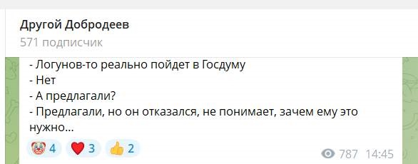 «Единая Россия» в этой ситуации предпочитает многозначительно намекать, подавать невербальные знаки и подмигивать. Так, в сообщении о крупном партийном мероприятии 8 марта перечисляются только трое депутатов от партии в Госдуме, без Антона Красноштанова. С другой стороны, и Логунова там тоже не было, но был первоначально ожидавшийся конкурент Антона Алексеевича внутри «берлоги» Даниил Литвинов, который из всего Заксобрания был один.