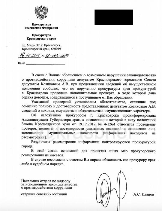 Напомним, что телеграм-канал «КРАСНОЯРСК brief» опубликовал скан ответа прокуратуры по результатам проверки официальных сведений об имущественном положении Андрея Козикова.