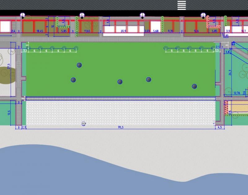 Зеленым на схеме благоустройства обозначен газон, а берег будет галечным. Между травой и галькой должны проложить дорожку из брусчатки.