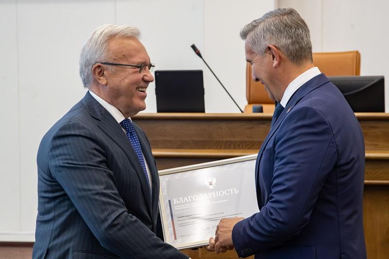 Затем довольно неожиданно инициативу в свои руки взял сенатор РФ от Красноярского края Александр Усс. Он рассказал о законотворческой деятельности верхней палаты федерального парламента РФ и вручил Алексею Додатко благодарственное письмо от председателя Совета Федерации Валентины Матвиенко.