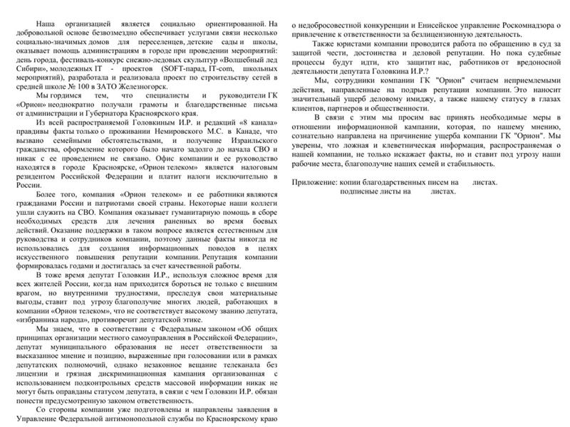 По мнению Немировского, депутат Законодательного собрания края Ирина Иванова, кроме того, что является супругой Головкина, тоже участвует в травле «Ориона». А экс-сотрудник А.Л. Черкашин якобы мог предоставить Головкину информацию о внутренних делах «Орион Телекома».