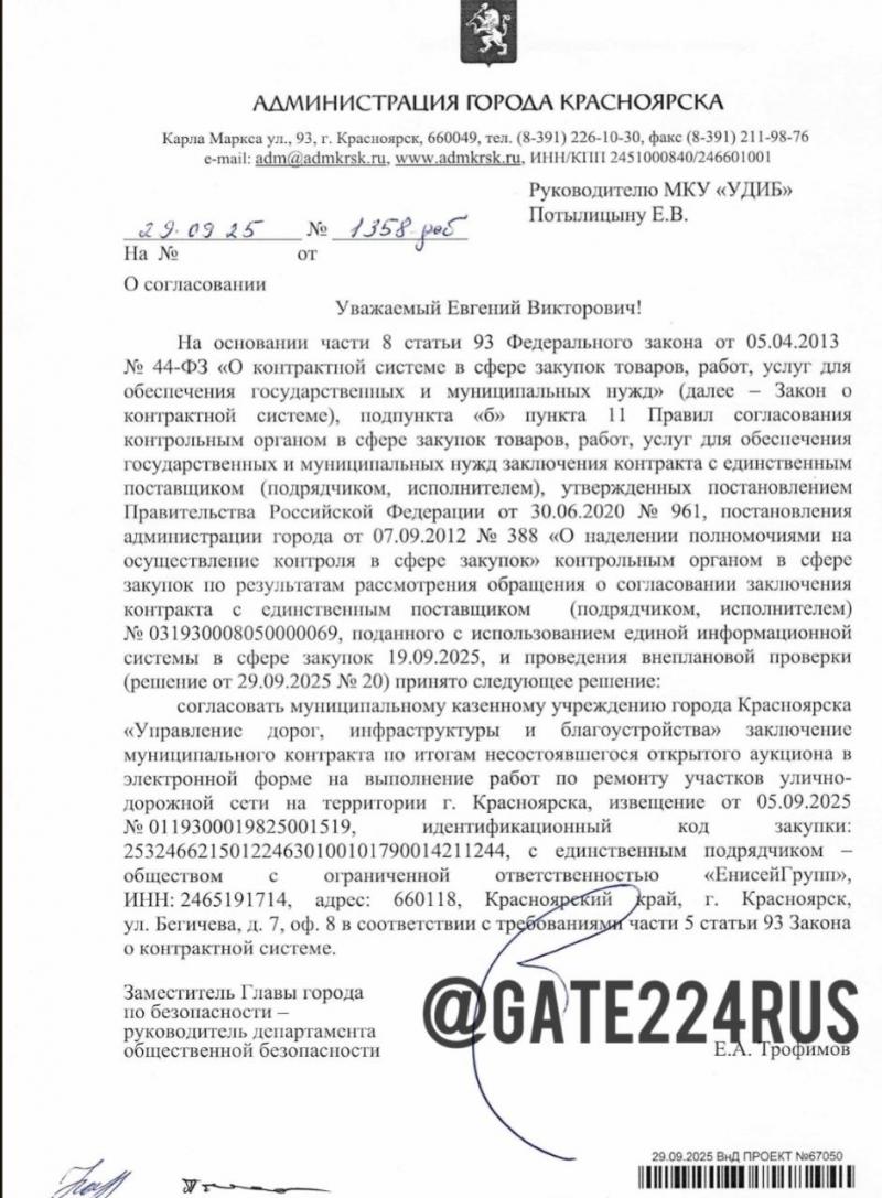 «Енисейгрупп», сорвавшая сроки ремонта в центре города, получает новый объём на 30 млн в обход конкурсных процедур. Это происходит сразу после публичной инспекции дорожных работ, на которой Одинцов под камеры раздавал жёсткие предупреждения подрядчикам, а контора продолжает срывать все сроки.
