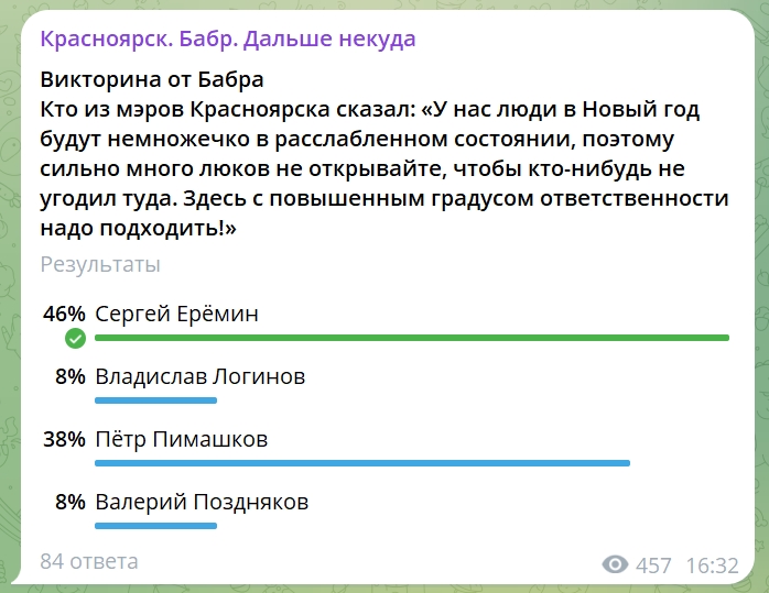 Настало время подвести итоги викторины и узнать, насколько хорошо подписчики и читатели Бабра помнят и знают красноярских градоначальников и их замысловатые высказывания. Вопрос был без подвоха, однако правильный вариант ответа выбрали 46% проголосовавших.
