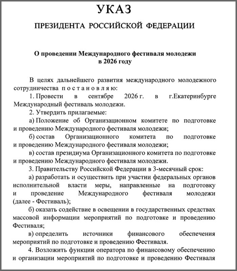 Президент России Владимир Путин подписал указ о проведении Международного фестиваля молодежи в сентябре 2026 года в Екатеринбурге. Документ опубликован на официальном портале правовых актов. Мероприятие соберет около 10 тысяч участников в возрасте от 14 до 35 лет, половина из которых — иностранные гости из десятков стран.