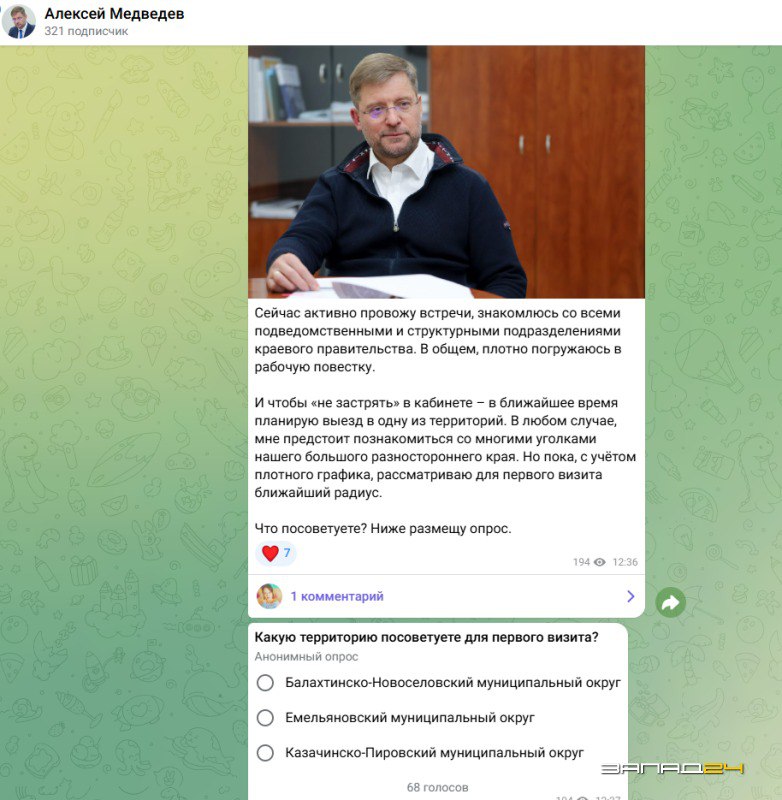 Быть может, край для Алексея Михайловича пока в диковинку, потому что он даже запустил опрос, куда ему посоветуют отправиться подписчики. Кстати, комментарии к постам у председателя открыты, не боится ли увидеть какие-нибудь другие направления, кроме территорий Красноярского края?