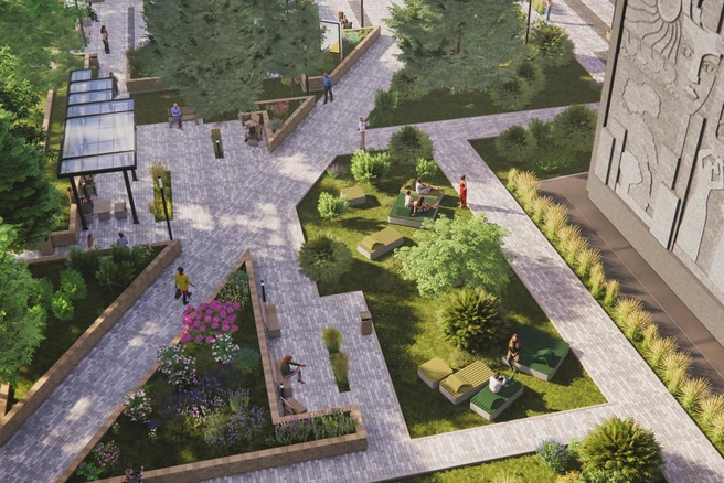 Директор культурного центра Лада Богряцова рассказала, что новую тротуарную плитку выложат в виде клавиш пианино. Рабочие установят клумбы высотой 60 сантиметров, навесы, качели и скамейки из бетона и дерева. От шума проспекта Свободный отдыхающих защитит живая изгородь из деревьев и кустарников. Существующий памятник воинам-победителям с летящими журавлями попытаются вписать в новый ландшафт.