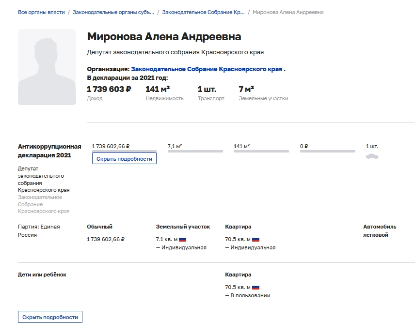 Согласно сайту «Декларации России» за 2021 год у депутата Заксобрания Алёны Мироновой доход составил миллион 739 тысяч рублей. Также в списке числится недвижимость, автомобиль и земельный участок. Квартира есть и у ребёнка Мироновой.