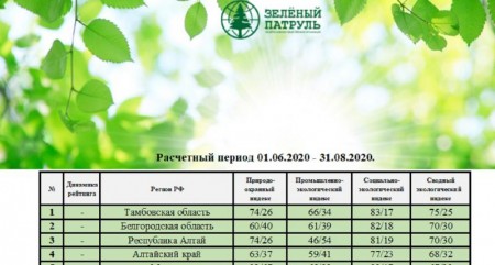Общероссийская общественная организация «Зелёный патруль» опубликовала очередной «Национальный экологический рейтинг» по итогам лета 2020 года. В нём суммируется вся промышленная и иная загрязняющая деятельность по субъектам РФ. По итогам результатов составляется рейтинг.