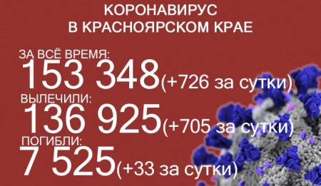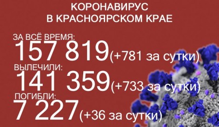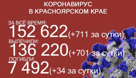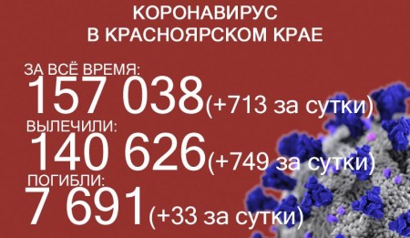 По данным на 6 декабря, в Красноярском крае 157 038 случаев заражения коронавирусом. За последние сутки выявили 713 заболевших. За всё время выздоровели 140 626 человек, в том числе 749 за последние сутки. Количество погибших достигло 7691, скончались ещё 33 заражённых COVID-19.