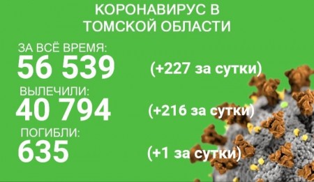 В Томской области за сутки со 2 по 3 декабря выявлено 227 новых случаев коронавируса. За все время в регионе заболели 56 539 человек. С начала эпидемии излечились 40 794 человека, 216 из них выздоровели в минувшие сутки.