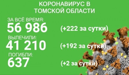 В Томской области за сутки с 4 по 5 декабря коронавирус выявлен еще у 222 человек. За все время зарегистрировано 56 986 случаев заболевания. В минувшие сутки выздоровели 192 пациента. С начала эпидемии излечились 41 210 человек.