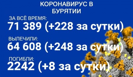 По данным на 7 декабря, еще 228 человек в Бурятии заболели COVID-19. Также за сутки 248 пациентов выздоровели, еще восемь скончались. Об этом сообщает пресс-служба регионального Роспотребнадзора. В настоящее время лечение в стационарах проходят 1240 человек с коронавирусом и подозрением на него.