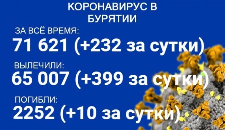 По данным на 8 декабря, еще 232 человека в Бурятии заболели COVID-19. Также за сутки 399 пациентов выздоровели, еще десять скончались. Об этом сообщает пресс-служба регионального Роспотребнадзора.