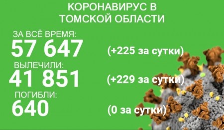 В Томской области за сутки с 7 по 8 декабря коронавирус выявлен у 225 человек. Всего в регионе зарегистрировано 57 647 случаев COVID-19. С начала эпидемии излечились 41 851 человек.