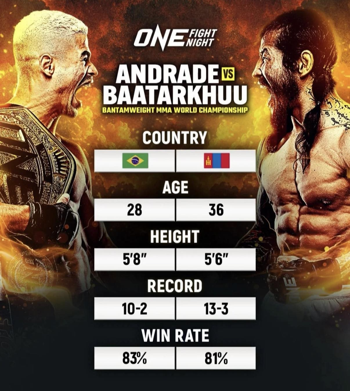 Для Андраде поражение стало болезненным. Он шел к титулу долгие годы. Бразилец выглядел уверенным и опасным соперником. Но его ошибка в четвертом раунде определила исход боя. Измотанный и потрясенный он уже не мог уйти от захвата. А Энх-Оргил использовал свой шанс почти идеально.