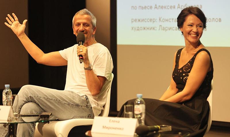 Константин Богомолов и Елена Мироненко на пресс-конференции по случаю гастролей Театра на Малой Бронной в Санкт-Петербурге, 2022 год