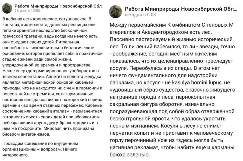 Как максимум – он сам разбавляет свои серые министерские будни литературными упражнениями. Бабр продолжит следить за вакханалией и постмодерном в неофициальном телеграм-канале Минприроды НСО.