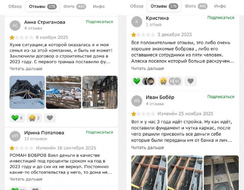 Претензии клиентов касались не только сроков, но и откровенно низкого качества работ. Один из заказчиков рассказывал, что за пять месяцев рабочие лишь снесли ворота, нанесли ущерб имуществу и захламили территорию. Вместо качественного септика в землю закопали два бетонных кольца без дна. Когда владелец потребовал объяснений, Бобров просто заявил: «Денег нет, стройтесь сами, войдите в положение». Другая пострадавшая заплатила пять миллионов за коттедж, но так и не смогла въехать: сроки постоянно срывались, а руководство уходило от разговоров о компенсации. Юрист Олеся Трошина отмечает, что часть каркасов в «Аляске» признана аварийной: там не соблюдалась технология ветрозащиты, а вместо нормального бруса использовались гнилые доски, которые промерзали в первую же зиму.