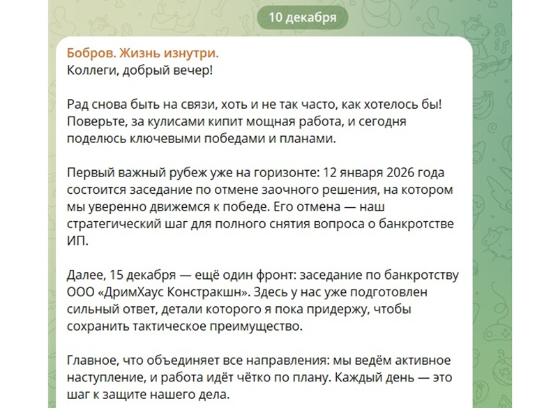 Роман Бобров считал, что массовые аресты счетов парализуют работу организации и не дают достроить дома. В своём телеграм-канале за несколько часов до визита в прокуратуру он опубликовал пост. В нём он писал, что «за кулисами кипит мощная работа», и называл информацию об уголовном деле «медийным шумом» оппонентов. Однако документы показывают, что при многомиллионной чистой прибыли в 2023 году застройщик не смог закрыть обязательства перед клиентами, чьи дома стоили в десятки раз меньше заработанных компанией средств.