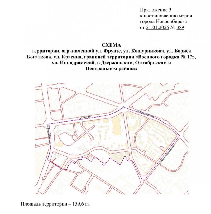 21 января 2026 года мэрия Новосибирска выпустила постановление №389 «О подготовке проекта планировки и проекта межевания территории, ограниченной ул. Фрунзе, ул. Кошурникова, ул. Бориса Богаткова, ул. Красина, границей территории «Военного городка № 17», ул. Ипподромской, в Дзержинском, Октябрьском и Центральном районах».