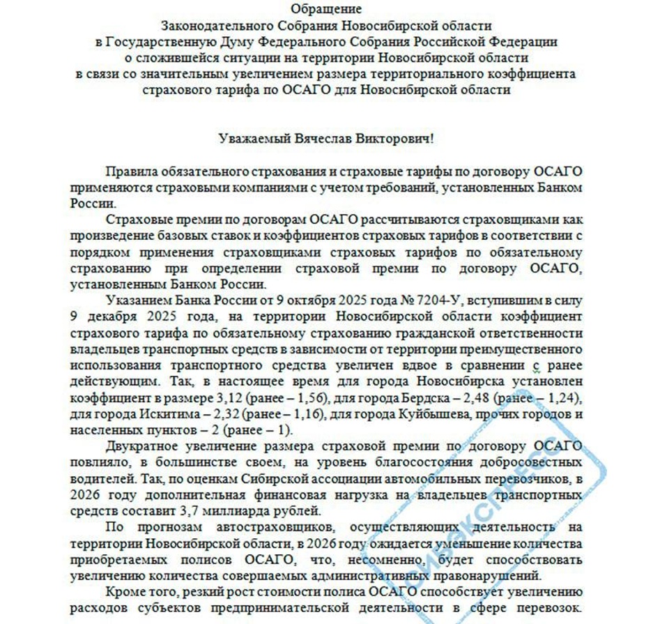 На сессии Законодательного собрания 29 января 2026 года депутаты без лишних споров приняли обращение к руководству Госдумы и Центрального банка. Главное требование — вывести Новосибирскую область из списка регионов с высокими рисками мошенничества в сфере ОСАГО. Из-за нахождения в так называемой «красной зоне» Банк России ещё в декабре прошлого года изменил параметры расчётов тарифов, удвоив территориальный коэффициент для местных автовладельцев. Если раньше для Новосибирска он составлял 1,56, то теперь подскочил до 3,12. В соседних Бердске и Искитиме ситуация не лучше — там коэффициенты выросли до 2,48 и 2,32 соответственно. По сути, федеральный регулятор ввёл специальный налог на сибиряков только за то, что в регионе орудуют банды автоподставщиков.