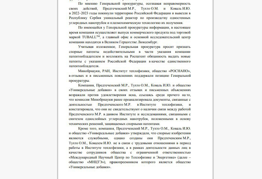 Авторы патента Михаил Предтеченский, Илья Коваль, Олег Тухто в период работы в институте за счет средств федерального бюджета выполняли фундаментальные исследования, ну а сам Предтеченский с 23 ноября 1995 года по 12 сентября 2024 являлся заведующим научно-исследовательской лабораторией физико-химических процессов в энергетике и руководил соответствующими разработками». Еще в 1999 году Предтеченский в рамках научного проекта создал пилотный макет плазмотрона и изучал режимы его работы. В 2004—2009 годы, также в рамках научного проекта, он разрабатывал принципиальную конструкцию плазмохимического реактора с жидкометаллическими электродами, получил электрические и тепловые характеристики мощного дугового разряда и определил области его устойчивой работы. Иными словами, поскольку все разработки по производству нанотрубок много лет велись на государственные деньги, то и патенты должны принадлежать государству, тем более оно вложило в проект более миллиарда долларов.