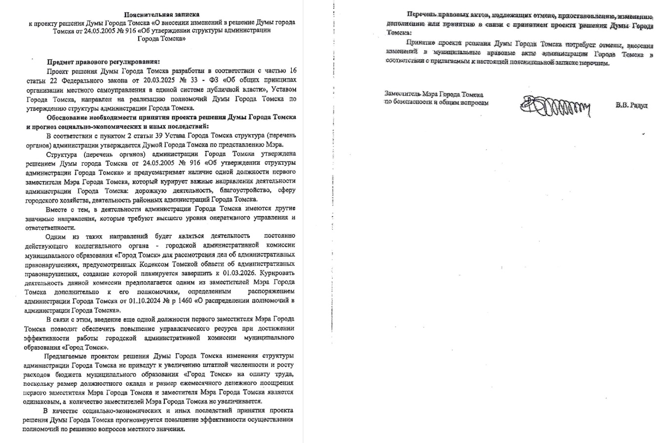 Формально чиновники провернули обычную кадровую рокировку. В решении думы Томска от 24 мая 2005 года просто заменили слова «первого заместителя» на «первых заместителей». Чтобы не злить общественность разговорами о раздувании штата, одну должность обычного зама упразднили, а на её месте создали второе «первое» кресло. Финансово-экономическое обоснование за подписью заместителя по безопасности Владимира Радула гласит, что бюджет города не пострадает. Зарплаты и надбавки у обычных замов и «первых» якобы одинаковые, поэтому дополнительных трат на содержание чиновников не потребуется.